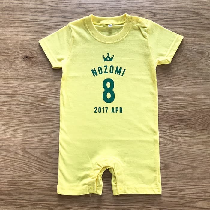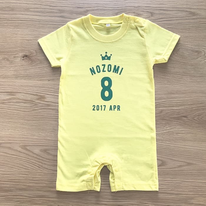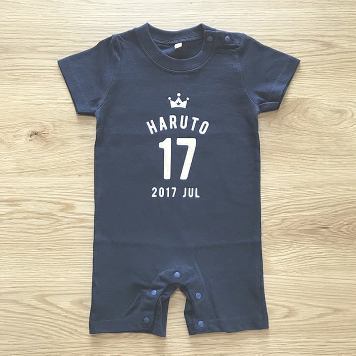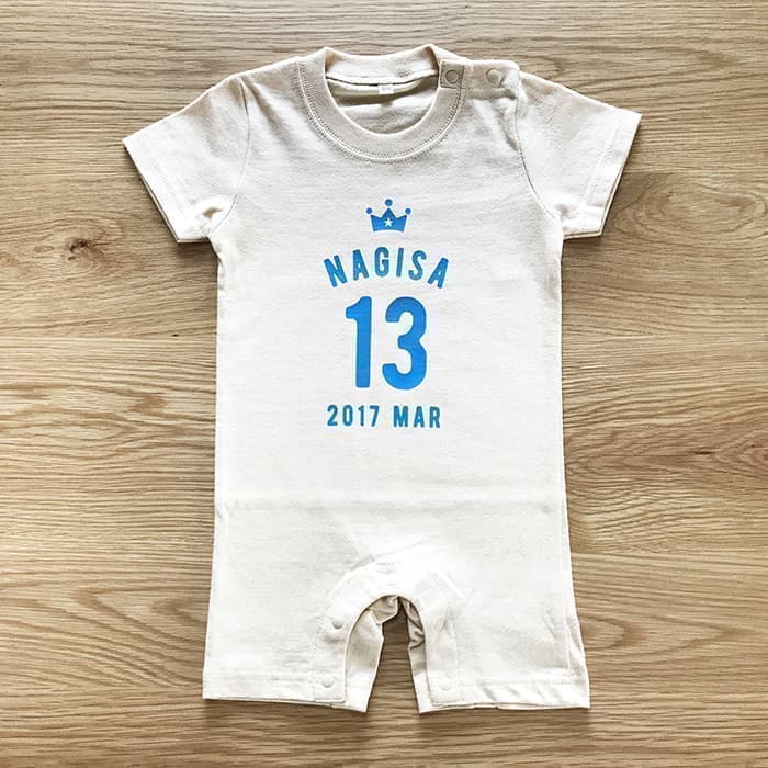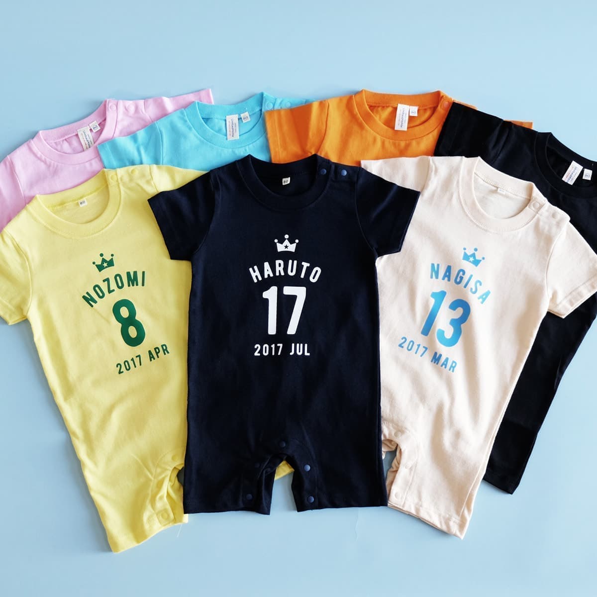 赤ちゃんのお名前と誕生日が印刷されたオリジナルロンパースです。おしゃれな5色から選べてギフトにも最適です。